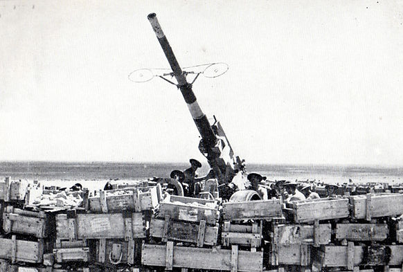 Un cañón antiaéreo en Tobruk, rodeado de cajas de municiones llenas con piedra.