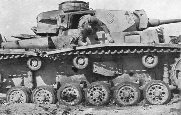 El lado brutal de la campaña en el norte de África, la imagen muestra un Panzerkampfwagen III destruido en Túnez con un desafortunado miembro de la tripulación que no logró salir del tanque en llamas, en marzo de 1943.